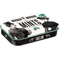Scatolina XL in metallo con mentine 6 x 9,5 x 2 cm, resistente, sigillata, riempita con squisite pastigliette alla menta piperita.
